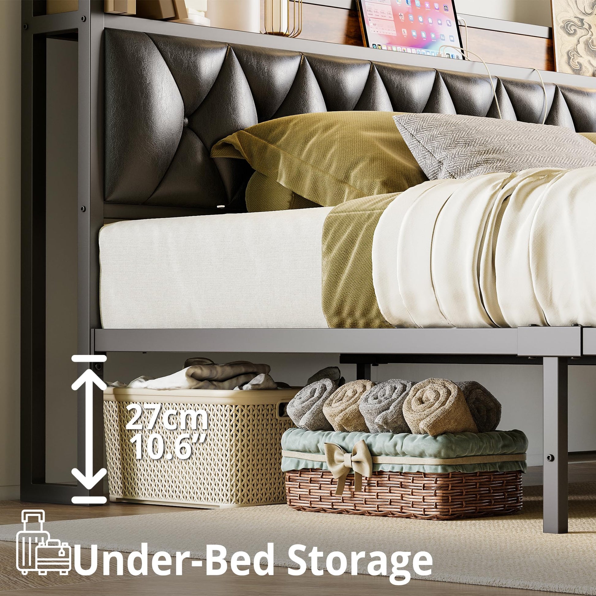 - Outlet: With an integrated outlet, the king bed frame offers a convenient solution for charging your electronic devices overnight. You no longer have to worry about reaching for a distant outlet or searching for a power bank