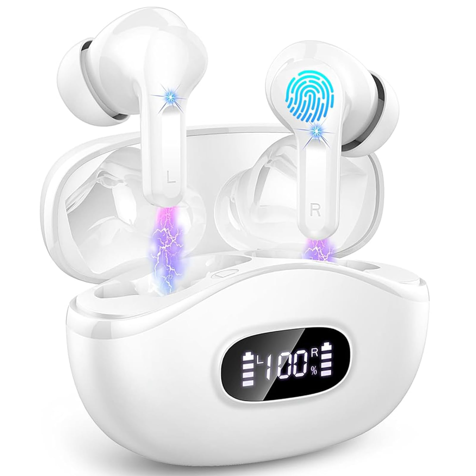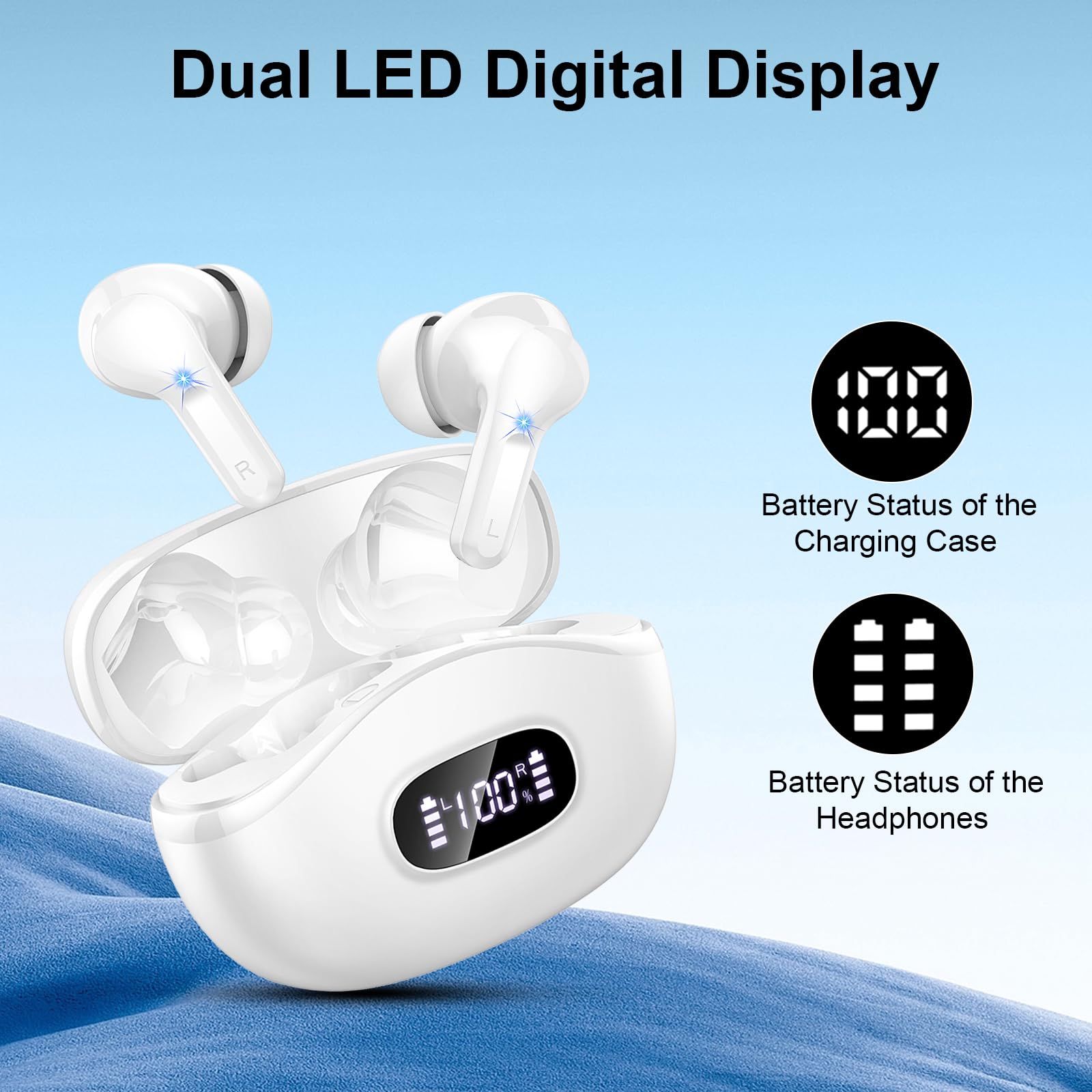 Wireless Earbuds, 2024 Bluetooth Headphones V5.3 HiFi Stereo Ear buds with ENC Noise Cancelling Mics, 40H Bluetooth Earbuds with Dual LED Display, IP7 Waterproof Earphones for Android iOS, White